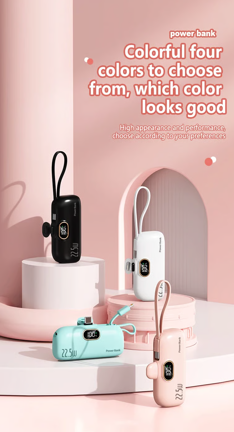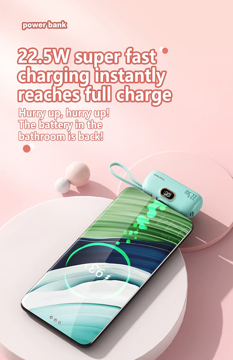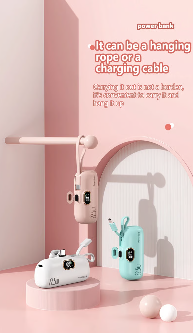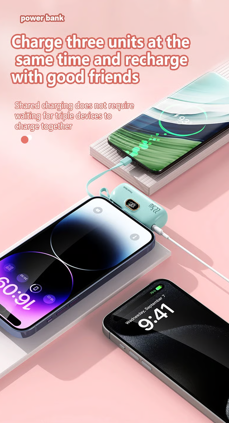 Do you always carry a bunch of chargers when you go out? 5000 mAh Mini Power Bank for mobile phones. 22.5W fast charger with three ports and digital display. lightweight and compact.