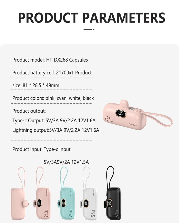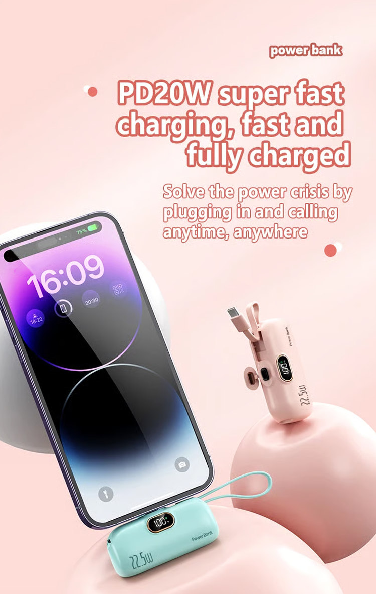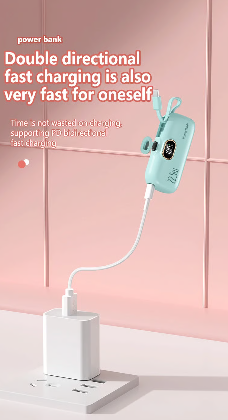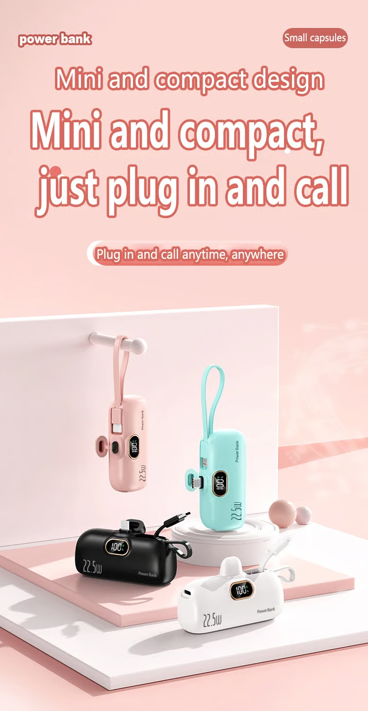 Do you always carry a bunch of chargers when you go out? 5000 mAh Mini Power Bank for mobile phones. 22.5W fast charger with three ports and digital display. lightweight and compact.